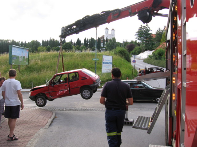 Bergung des verunfallten PKWs mittels SRF-Kran.