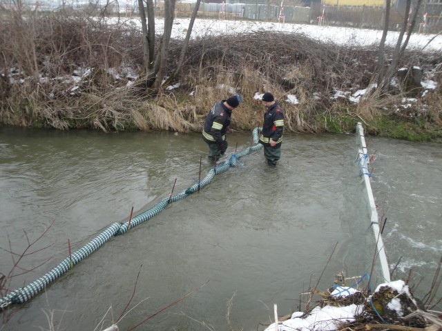 Setzen von Ölsperren vor den Klärbecken und weiterer Ölsperren entlang des Weizbaches in Preding.