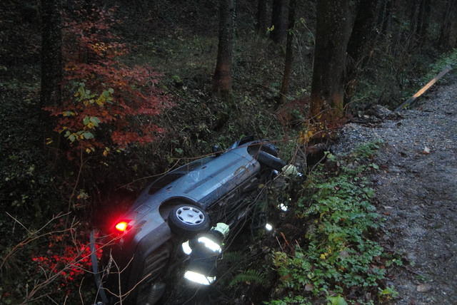 Ein PKW ist in einer Kurve von der Straße abgekommen und rund 15 Meter abgestürzt. Die Fahrzeuginsassen konnten sich selbst unverletzt befreien.