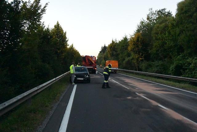 Ein PKW ist mit einem weiteren PKW kollidiert. Betriebsmittel treten aus, Staubildung auf der B64.
