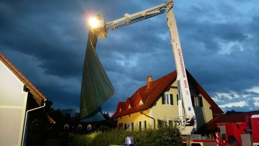 Erkundung der Lage, Kontrolle des Dachbereiches mit Wärmebildkamera, Verständigung des Energieversorgungsunternehmens, Entfernen von losen Dachziegeln sowie Anbringen einer Plane mittels Teleskopmastbühne