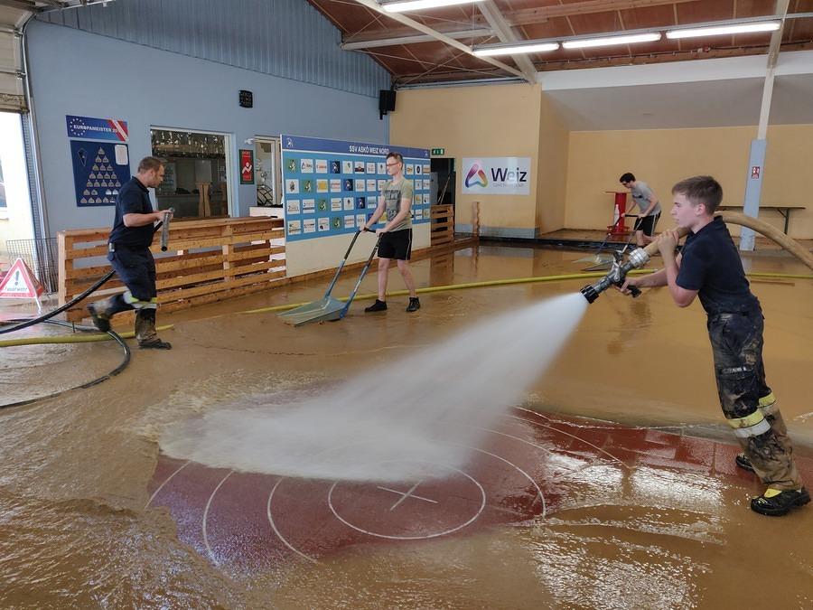Die Stocksporthalle steht nach dem nächtlichen Unwetter ca. 15cm unter Wasser und ist verschlammt.