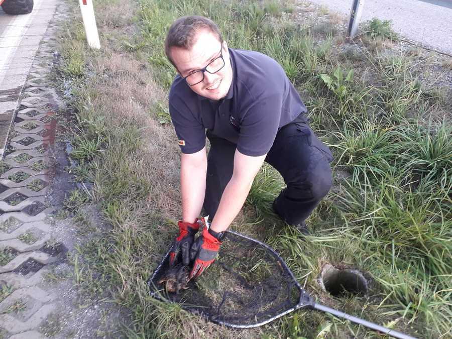 Eine Ente ist in einem Rohr gefangen und kann sich nicht selbst befreien