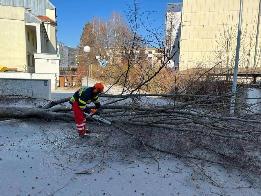Ein LKW hat einen Baum umgefahren, dieser blockiert eine Einfahrt bzw. die Straße