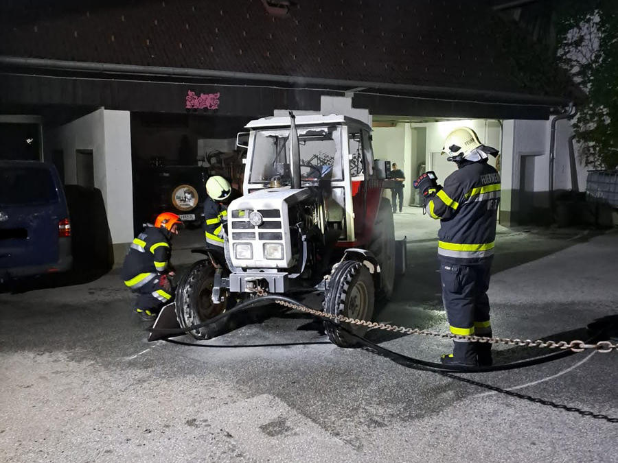 Ein Traktor stand in einem Wirtschaftsgebäude in Brand. Er wurde beim Eintreffen von den Besitzern schon aus dem Gebäude gezogen, der Brand wurde mit Handfeuerlöschern bereits gelöscht