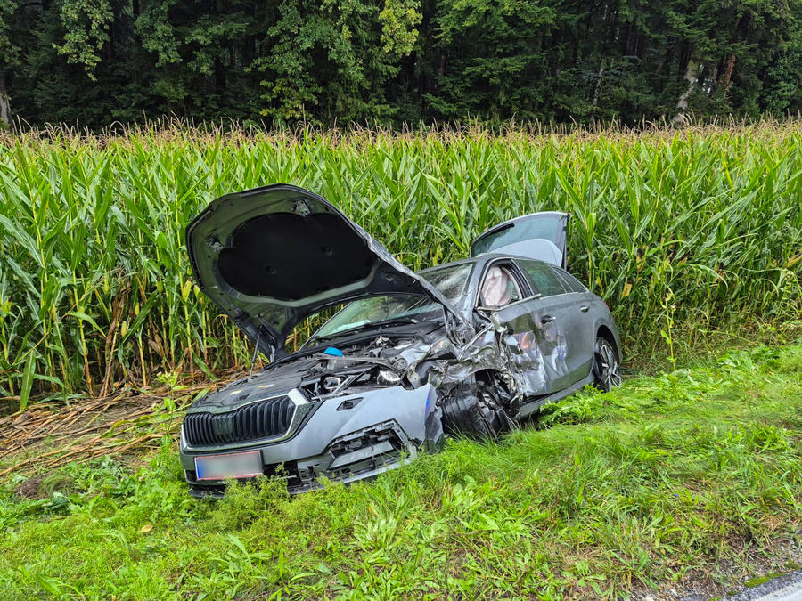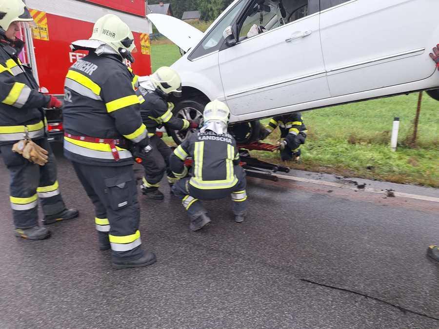 Ein PKW ist von der Straße abgekommen und hängt im Straßengraben fest. FF Landscha und Polizei sind vor Ort.