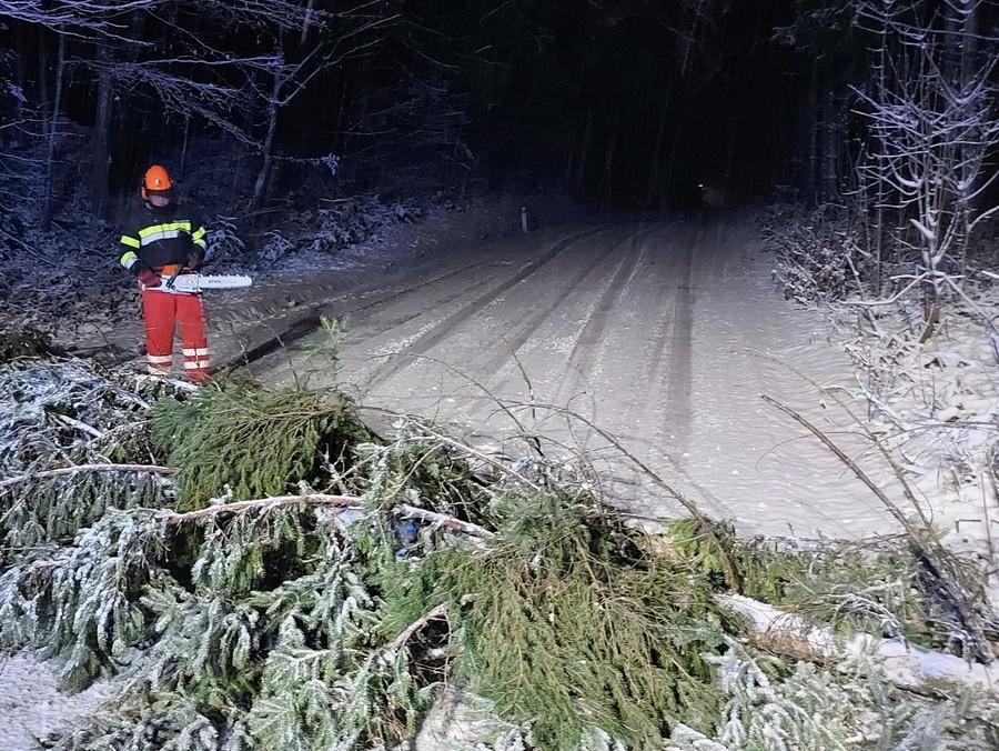 Ein umgestürzter Baum blockiert die Fahrbahn, ein weiterer Baum droht auf die Straße zu stürzen