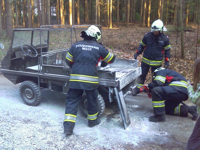 Löschen des Brandes mittels mehrerer Pulverlöscher und einem HD-Rohr. Abschleppen des PKWs aus dem Wald (Naturschutzgebiet) zur nächstgelegenen Straße.
