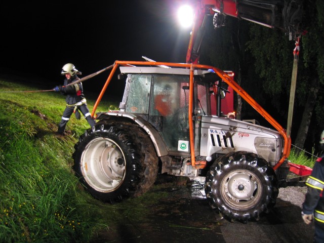 Ein Traktor ist samt Siloballenpresse umgestürzt.