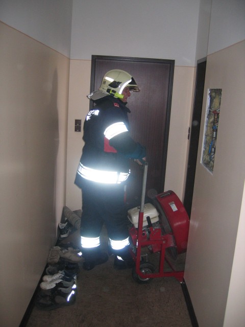 Absichern des Einsatzortes, Brandbekämpfung mittels CAFS-Löschgerät, Kontrolle des Brandherdes, Belüften der Wohnung mittels Hochleistungslüfter, Übergabe der drei verletzten Personen an das Rote Kreuz.