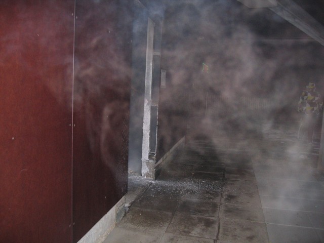 Löschen des Brandes mit CAFS-Löschgerät und Hochdruck-Rohr unter schwerem Atemschutz, Kontrolle des Müllraumes mit Wärmebildkamera und Temperaturmessgerät.