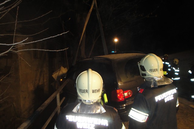 Absichern der Unfallstelle, Retten der verletzten Person mit dem Roten Kreuz aus dem verunfallten PKW, Aufbauen eines zweifachen Brandschutzes, Bergen von Fahrzeug- und Elektroverteiler-Teilen aus dem Weizbach, Bergen und Abtransport des PKWs zur nächsten Ausweichstelle.