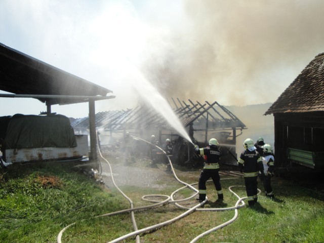 Schützen der angrenzenden Wirtschaftsgebäude sowie des Wohnhauses, Brandbekämpfung mit acht C-Rohren und Herstellen von Zubringleitungen von zwei Hydranten und vom ca. 500m entfernten Fladnitzbach. Nachlöscharbeiten durchführen.