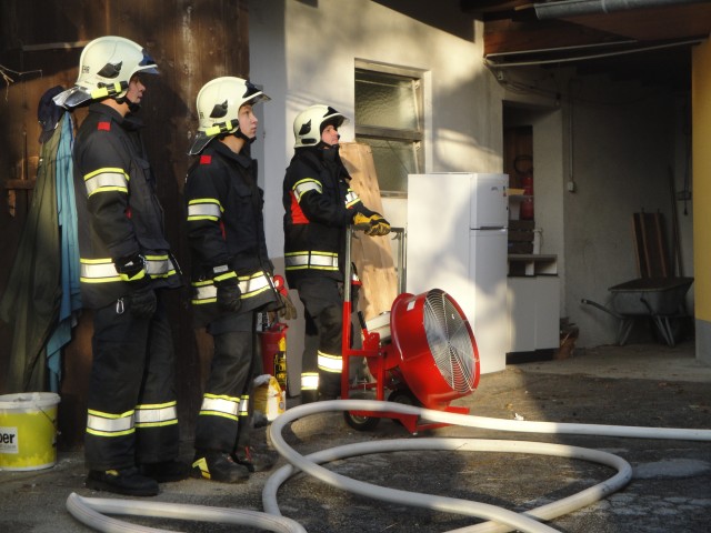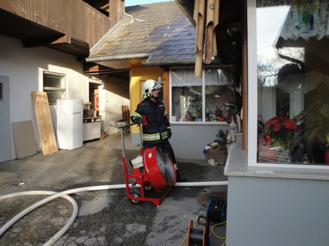 Brandbekämpfung im Obergeschoß durch Innenangriff unter schwerem Atemschutz mit C-Rohr und CAFS-Löschgerät, Errichten eines Atemschutz-Sammelplatzes für 3 Atemschutz-Trupps im Einsatz und einen Atemschutz-Rettungstrupp, Druckbelüften des Objektes, Verständigung des Roten Kreuzes, der Polizei und des Energieversorgungsunternehmens, Verständigung der FF Landscha mit 2 Atemschutz-Reservetrupps, Wasserversorgung mittels WLF und WAB 8000/500. Kontrolle des Objektes mit Wärmebildkamera und Ausräumen des Brandgutes.