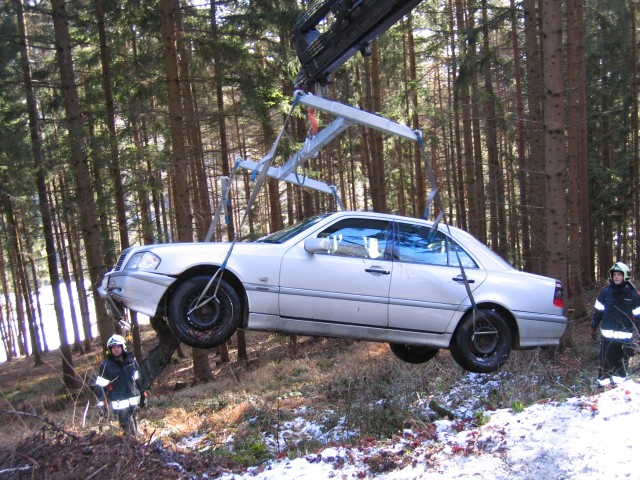 Ein PKW ist von der Straße abgekommen und befindet sich in einem Waldstück.