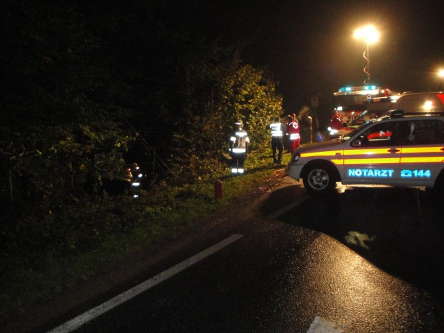 Ein PKW ist von der Bundesstraße abgekommen und gegen einen Baum geprallt. Eine Person ist im Fahrzeug eingeklemmt.