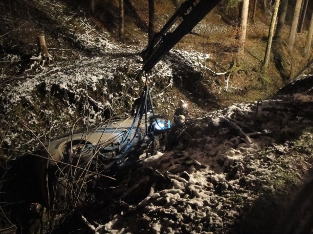 Ein PKW ist von der Straße abgekommen und liegt seitlich in einem Bachbett. Es befinden sich keine Personen mehr im Fahrzeug.