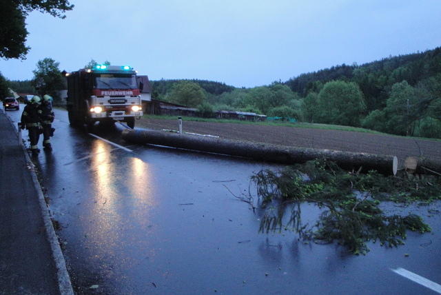 Aufgrund des starken Windes blockiert ein umgestürzter Baum die Fahrbahn.