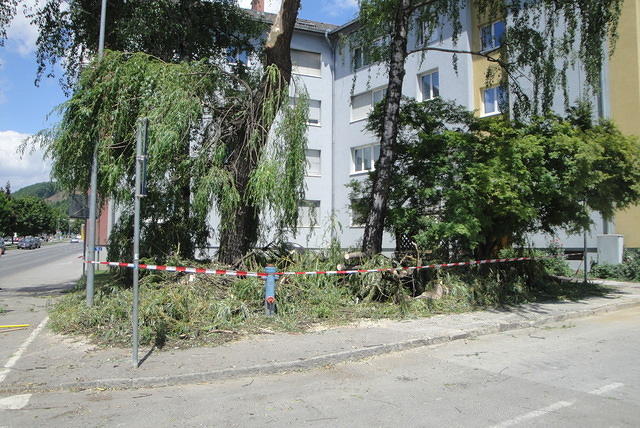Ein Baum ist umgestürzt und blockiert die B64 (Dr.-Karl-Widdmannstraße) auf Höhe Kreuzung Fa. Andritz Hydro.