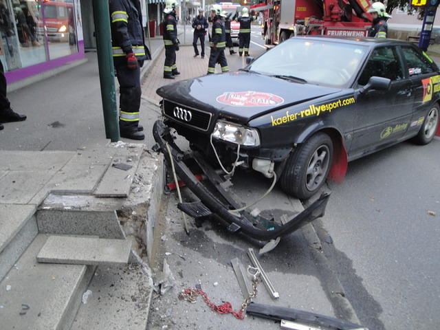 Ein PKW steht schwer beschädigt am Straßenrand bzw. Gehsteig. Die Polizei ist bereits vor Ort.