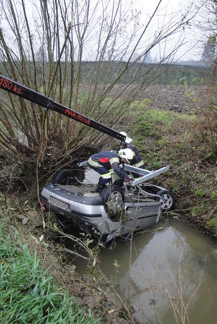 Ein PKW ist von der Fahrbahn abgekommen und liegt am Dach im Bachbett. Öl tritt ins Gewässer aus. FF Rollsdorf ist bereits vor Ort.