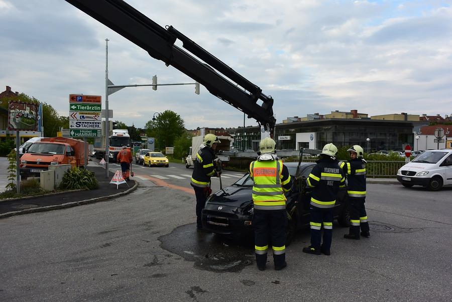 Verkehrsunfall im Kreuzungsbereich. Betriebsmittel treten aus.