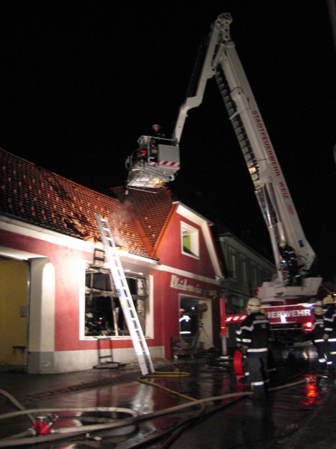 Durch das schnelle Eintreffen der ersten 2 Angrifftrupps konnte es verhindert werden, dass sich das Feuer auf das Dachgeschoß ausbreitet. Außenangriff in den Verkaufsraum unter schwerem Atemschutz mit 1 HD-Rohr, 1 C-Rohr und 1 ND-Rohr. Außenangriff auf die Dachhaut zum Objektschutz der angrenzenden Gebäude mit 1 HD-Rohr und 1 C-Rohr; Absperren des gesamten Einsatzbereiches von Hauptplatz bis Elingasse. Aufgrund der hohen Einsatzzahl der Atemschutzgeräteträger wurde vorsorglich ein RTW des Roten Kreuz Weiz mit zwei Mann angefordert. Verständigung des EVU, der Polizei, des Firmeninhabers und des Bürgermeisters. Kontrolle der angrenzenden Gebäude auf der Rückseite des Brandobjektes mit TMB-42. Es wurde eine Brandsicherheitswache mit 3 Mann für die Nacht abgestellt.