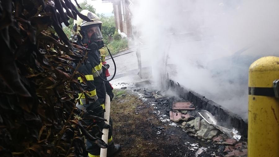 Erkunden der Lage, Schützen von zwei unmittelbar angrenzenden Wohngebäuden sowie Brandbekämpfung mittels 2 C-Rohren, 2 HD- und 1 ND-Rohr, Herstellen der Wasserversorgung von WLF sowie Hydrant durch 2 Zubringleitungen, Einsatz eines Atemschutz-Trupps im Bereich der Garage, Kontrolle der Gebäude mittels Wärmebildkamera und Temperaturmessgerät, Erkundung im Inneren der Gebäude, Kontrolle der Dachbereiche sowie Dämmungen auf Schwelbrände, Aufräumarbeiten.
