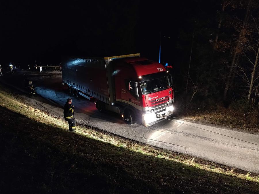 Ein Sattelzug hängt auf einer engen, steilen Gemeindestraße fest