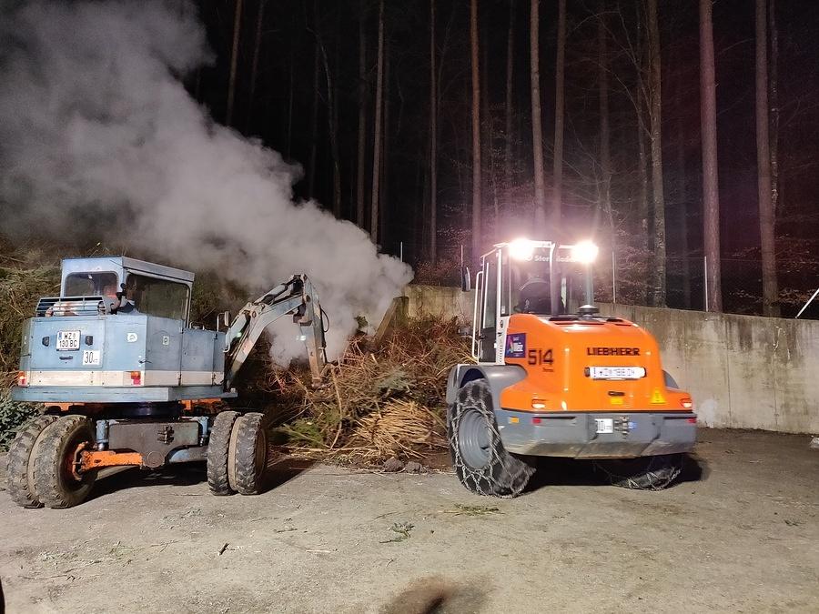 Verhinderung der Brandausbreitung auf den angrenzenden Wald, Löschen des Brandes mit 2 HD-Rohren, Zerteilen des Haufens mittels Radlader, Kontrolle mittels Wärmebildkamera