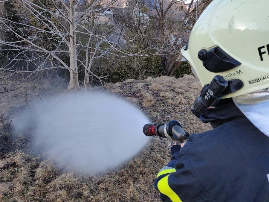 Löschen des Brandes mit Hilfe von Feuerpatschen und HD-Rohr, Kontrolle mittels Wärmebildkamera