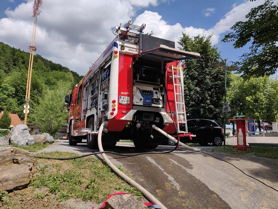 Auspumpen der Halle, Reinigung mittels C- und HD-Rohr, Aufbau eines provisorischen Damms mittels Paletten, Planen, Sandsäcken und Schotter, Entfernen des Schlamms am Vorplatz mittels Greifer