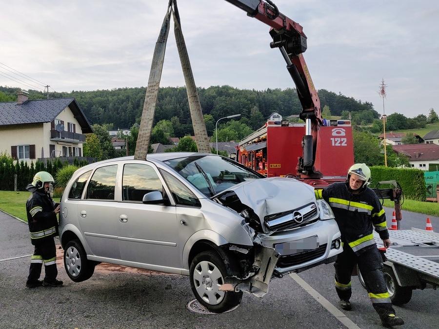 Ein PKW ist von der Straße abgekommen und gegen eine Zaunsäule geprallt, Betriebsmittel treten aus. Eine Person ist verletzt, das Rote Kreuz ist bereits vor Ort.