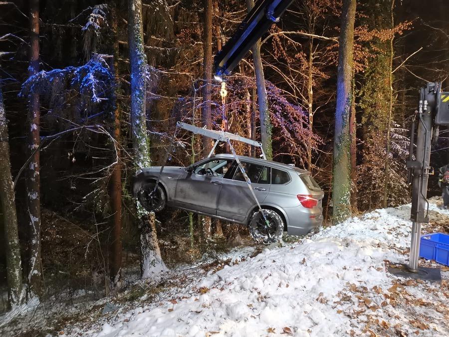Ein PKW ist von der Straße abgekommen und steht beschädigt auf einer Böschung. Die FF Kumberg ist bereits vor Ort.