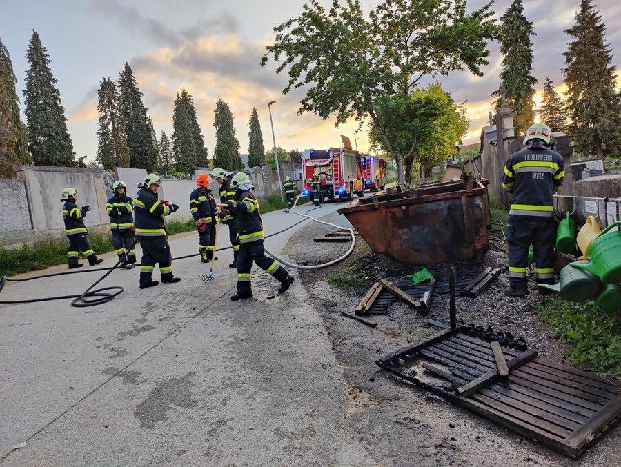 Ein Müllcontainer am Friedhof steht in Vollbrand