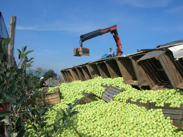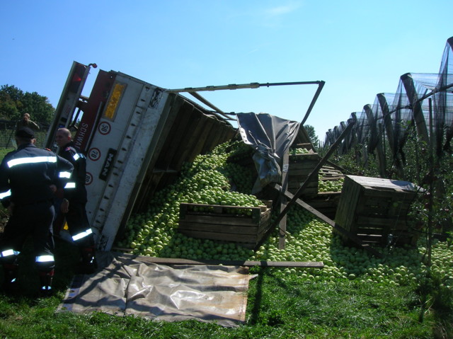 Ein mit Äpfeln geladener LKW-Zug ist umgekippt und liegt im Straßengraben.