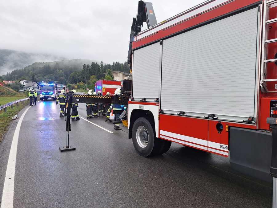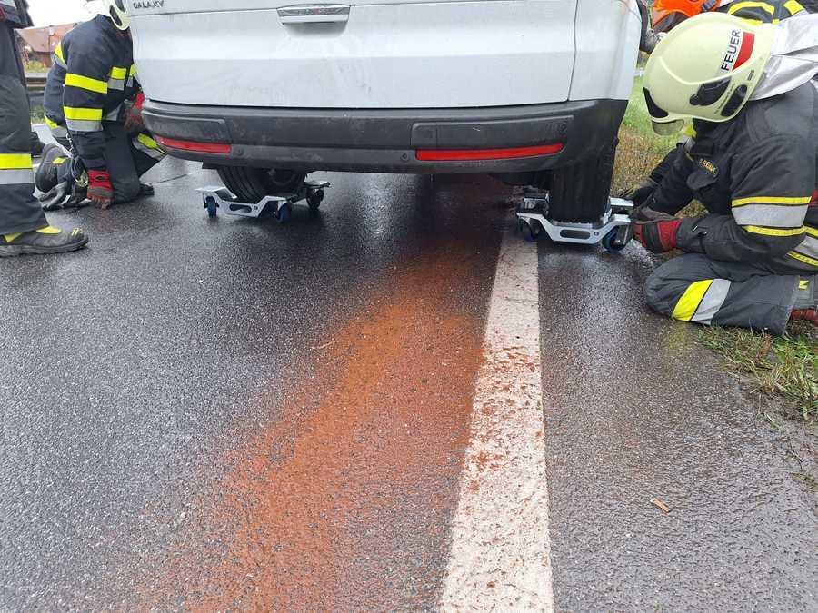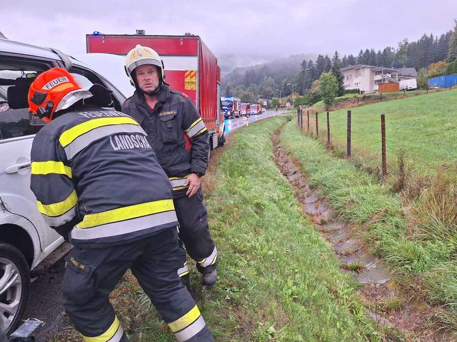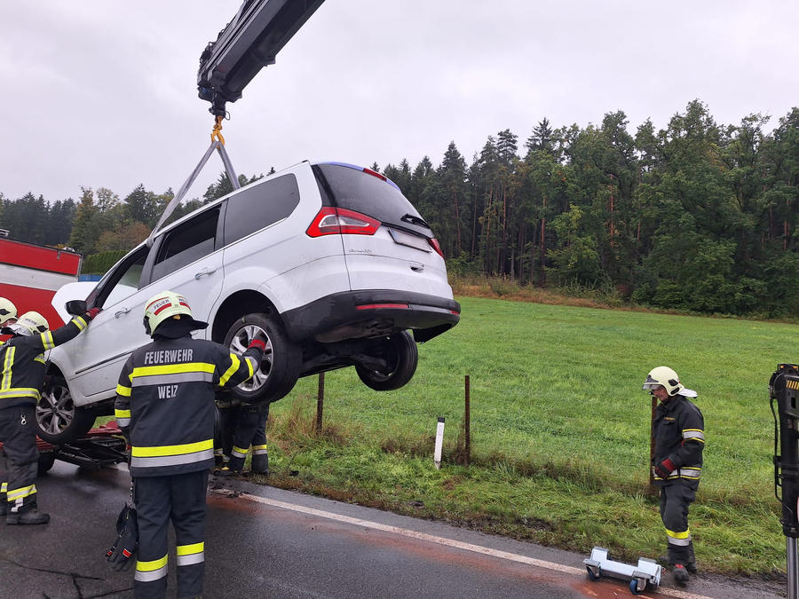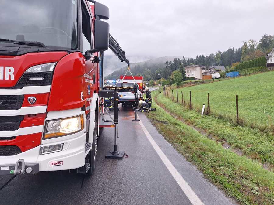 Ein PKW ist von der Straße abgekommen und hängt im Straßengraben fest. FF Landscha und Polizei sind vor Ort.