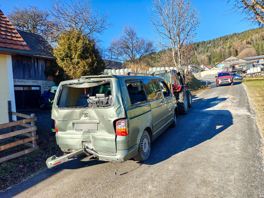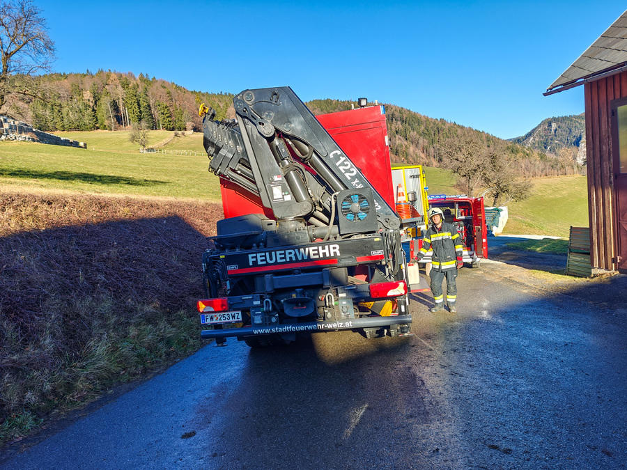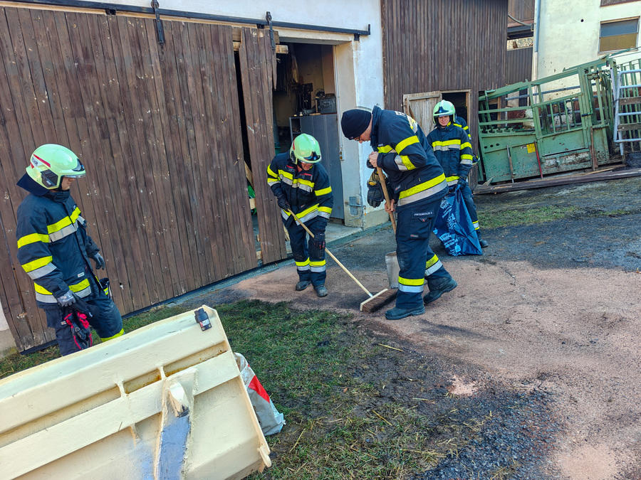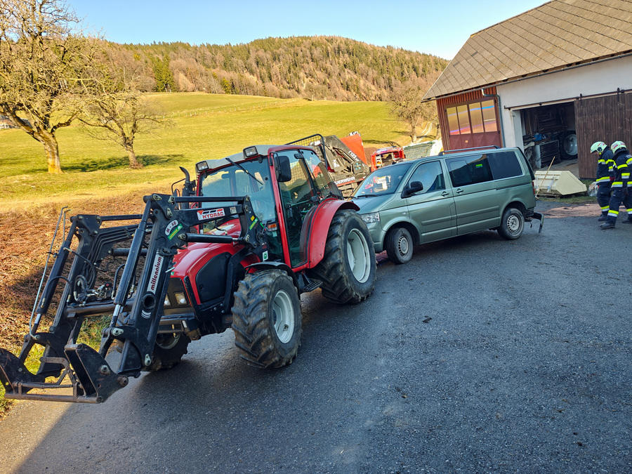 Ein Fahrzeug ist aus einer Einfahrt über eine steile Wiese gerollt, über eine Böschung gestürzt und gegen ein Wirtschaftsgebäude geprallt, Betriebsmittel sind ausgetreten.