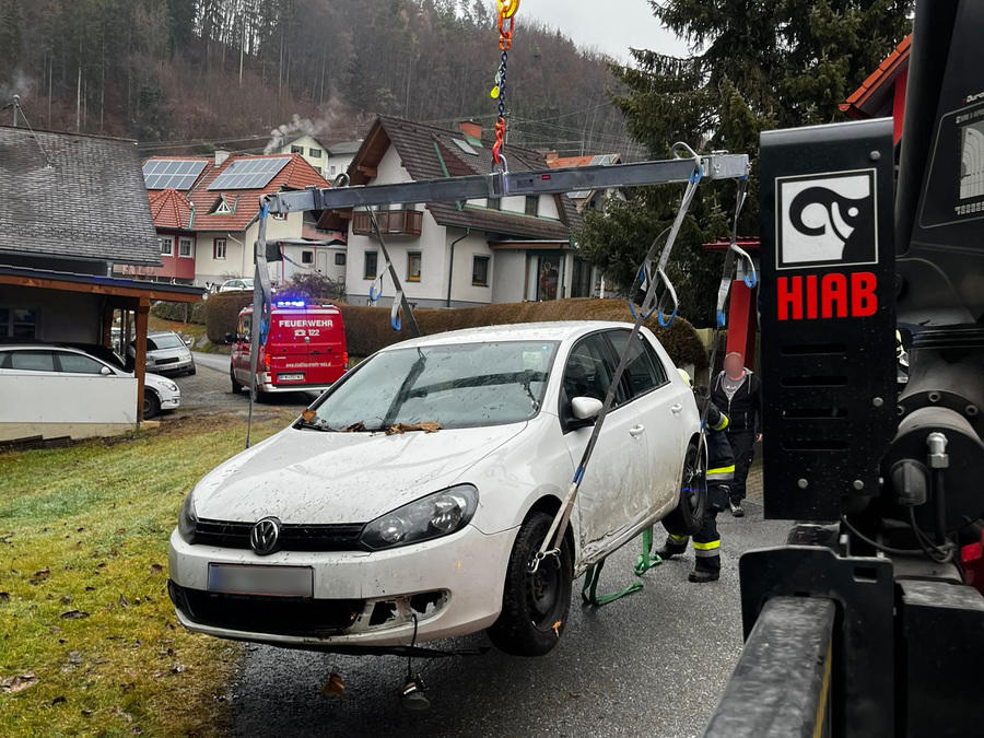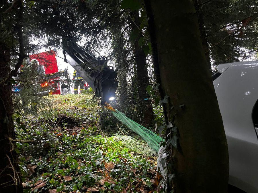 Ein abgestellter PKW ist über eine Böschung gerollt und in einem Wald zum Stehen gekommen