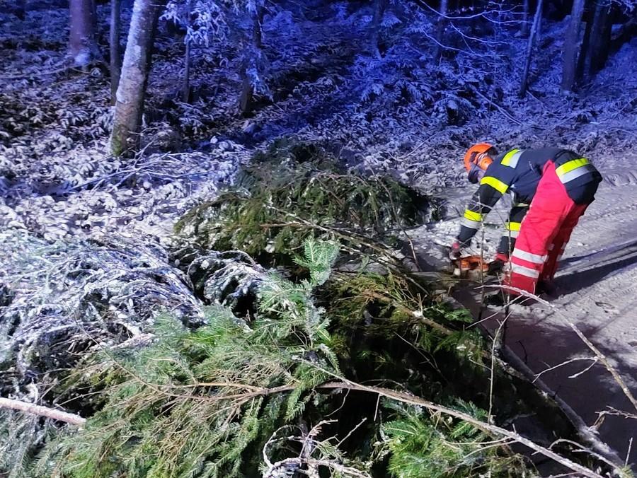 Ein umgestürzter Baum blockiert die Fahrbahn, ein weiterer Baum droht auf die Straße zu stürzen