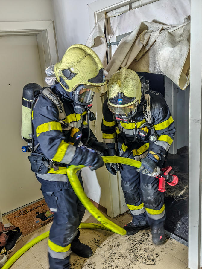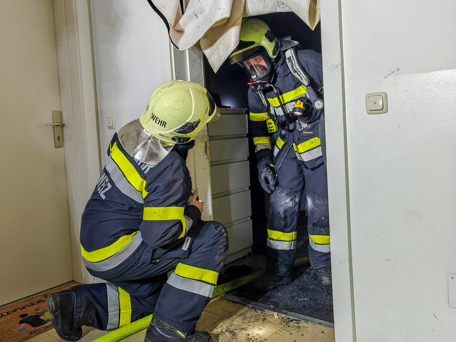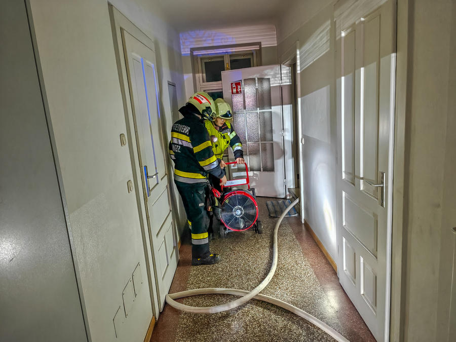 Beim Eintreffen wurden die Einsatzkräfte bereits von Bewohnern des Mehrparteienhauses empfangen und eingewiesen. Diese hatten Rauch aus einer Nachbarwohnung im ersten Obergeschoß bemerkt. Ein Atemschutztrupp setzte umgehend einen Rauchvorhang und öffnete die Wohnungstüre gewaltsam. Zeitgleich wurden zwei Drucklüfter in Stellung gebracht, um das Stiegenhaus rauchfrei zu halten. Zusätzlich stand ein Atemschutz-Rettungstrupp in Bereitschaft. Weitere Personen befanden sich zu diesem Zeitpunkt nicht mehr im Gebäude.