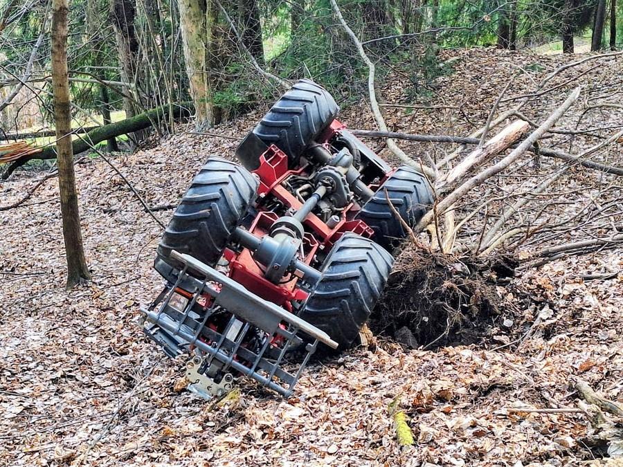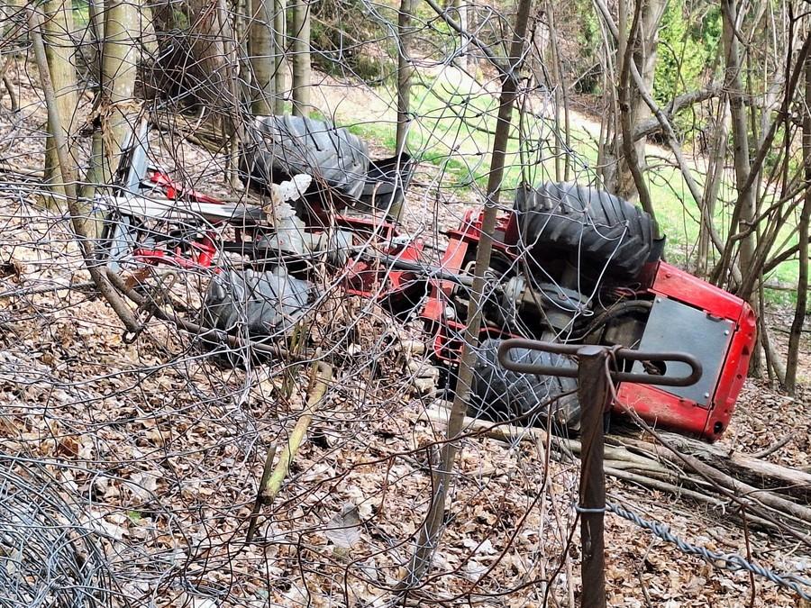 Ein Hoflader ist in unwegsamem Gelände umgestürzt.