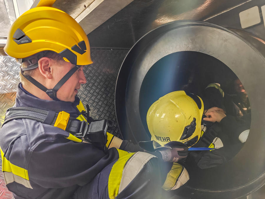 Die Ausbildung umfasste sowohl theoretische als auch praktische Elemente: Nach einer Einweisung in die CSE-Anlage erfolgte eine detaillierte Erläuterung zur Rettungsausrüstung und deren Anwendung. In den praktischen Übungen an der mobilen Trainingsanlage konnten die Einsatzkräfte verschiedene Rettungstechniken erproben. Dabei wurden unterschiedliche Szenarien durchgespielt, unter anderem das Retten eines verunfallten Atemschutzgeräteträgers sowie die Durchführung von Rettungsmaßnahmen mit MRAS-Ausrüstung. Zudem fand ein Training unter Schwerem Atemschutz statt, um die besonderen Herausforderungen solcher Situationen realistisch zu simulieren.