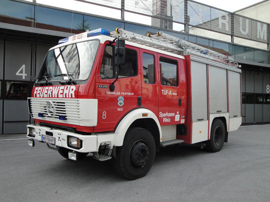 Dieses Fahrzeug dient der Brandbekämpfung. Durch das mitgeführte Löschmittel (Wasser und Schaum) ist