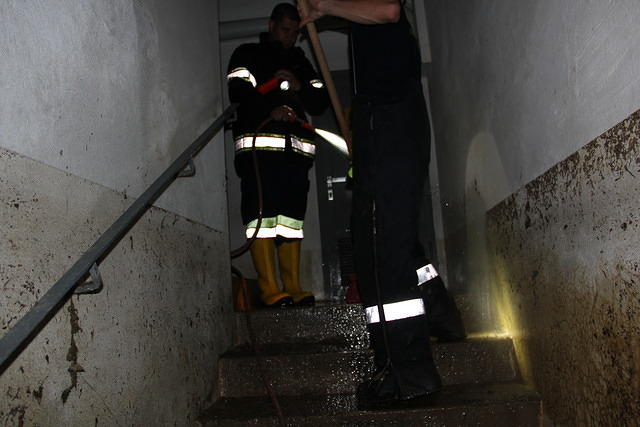 Aufgrund der starken Regenfälle vom Vortag steht der Keller eines Firmengebäudes ca. 1,5 Meter unter Wasser. Ebenfalls davon betroffen ist der 10-kV-Hochspannungsverteilerraum in diesem Gebäude.